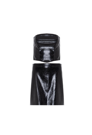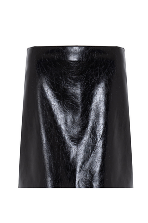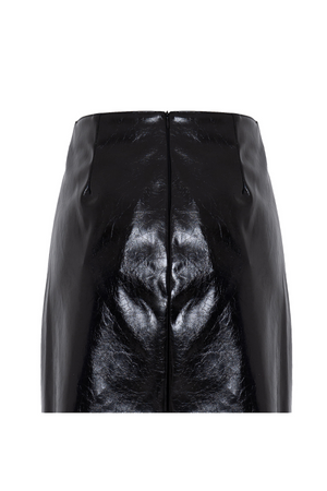 Mini saia de vinil craquelado, modelagem evasê com fechamento posterior por zíper.
