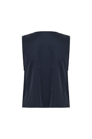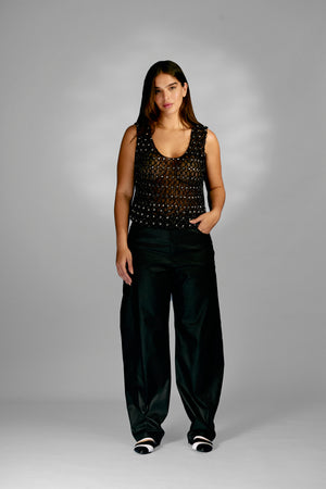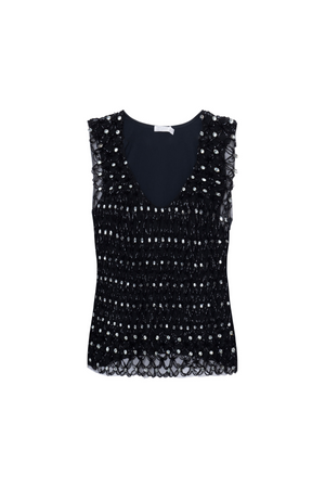 Blusa sem mangas com bordado refinado em padronagem sofisticada, enriquecida por vidrilhos e cristais que conferem brilho sutil e elegante. Ideal para quem busca um toque de glamour discreto e requinte em eventos especiais ou ocasiões que pedem um visual distinto.