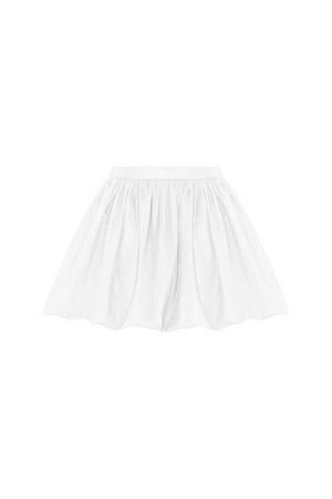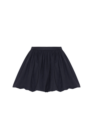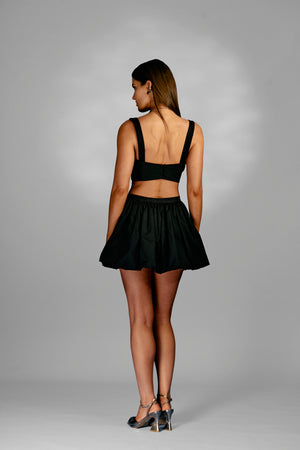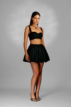 Saia curta balonê. Com seu design volumoso e franzido, proporciona um visual estruturado e elegante, perfeito para quem busca um look diferenciado.