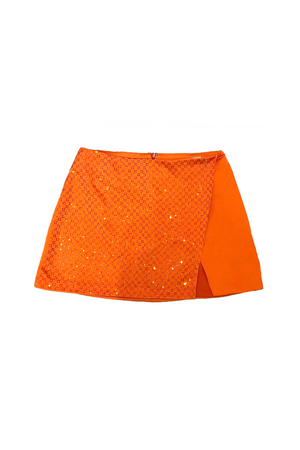 Saia curta evasê de crepe, com aplicações em cristais e mini fenda.
