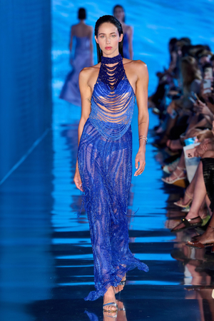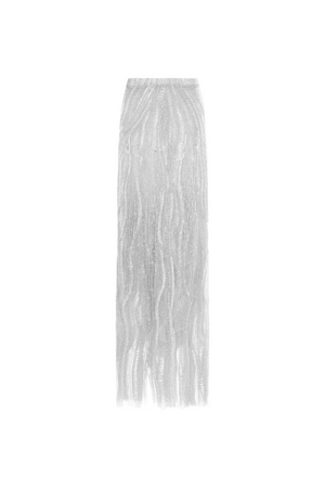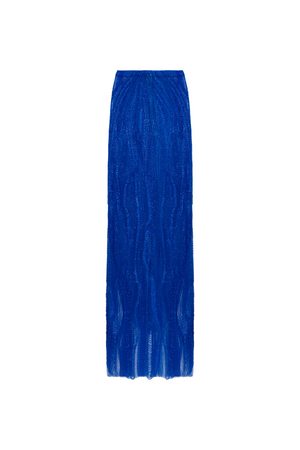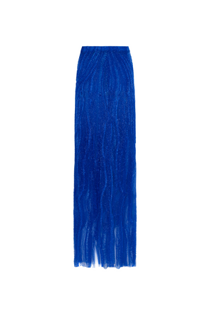 Saia longa toda bordado de ondas com franjas, possui forro.