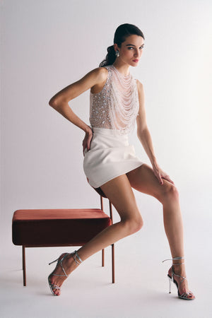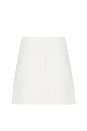 Mini saia de crepe evasê, peça-chave que pode ser facilmente combinada com uma variedade de tops e blusas.