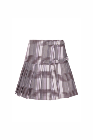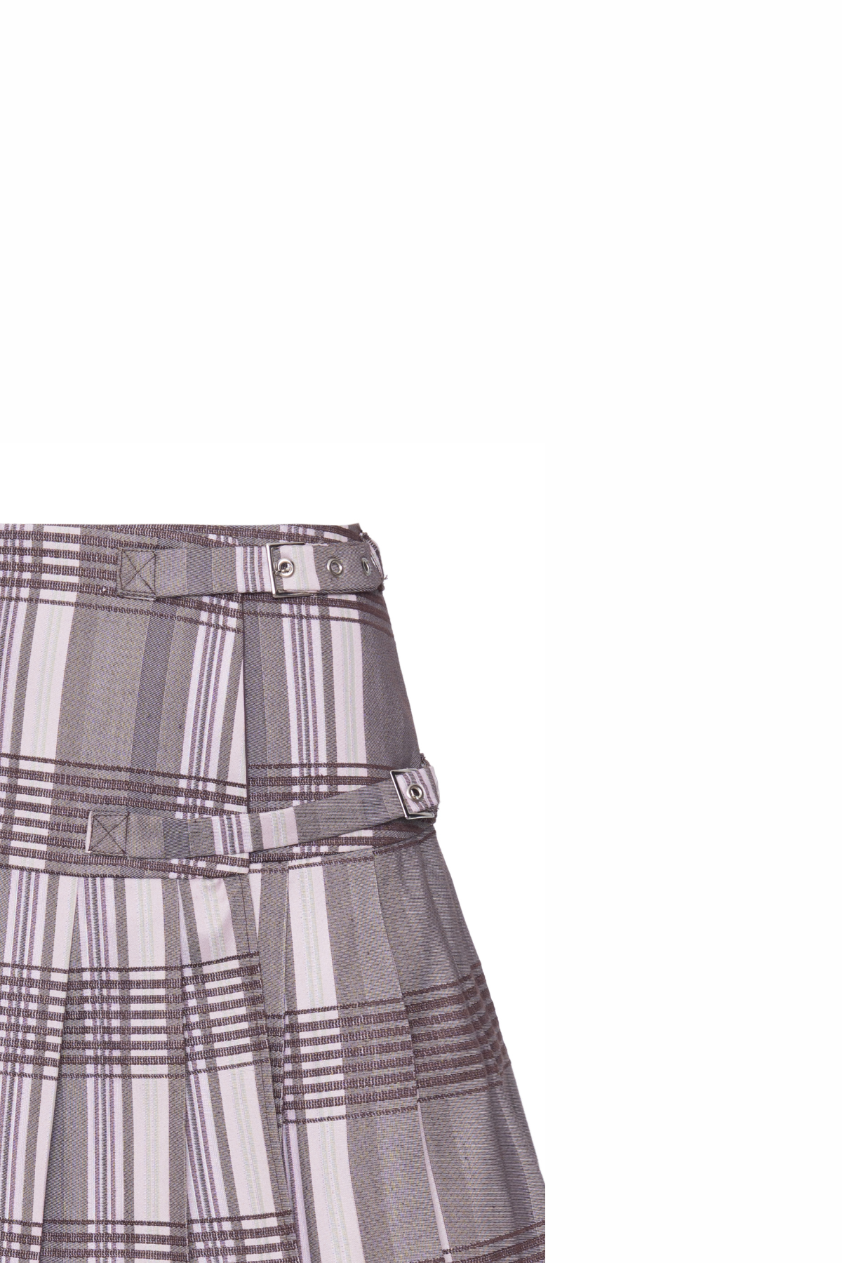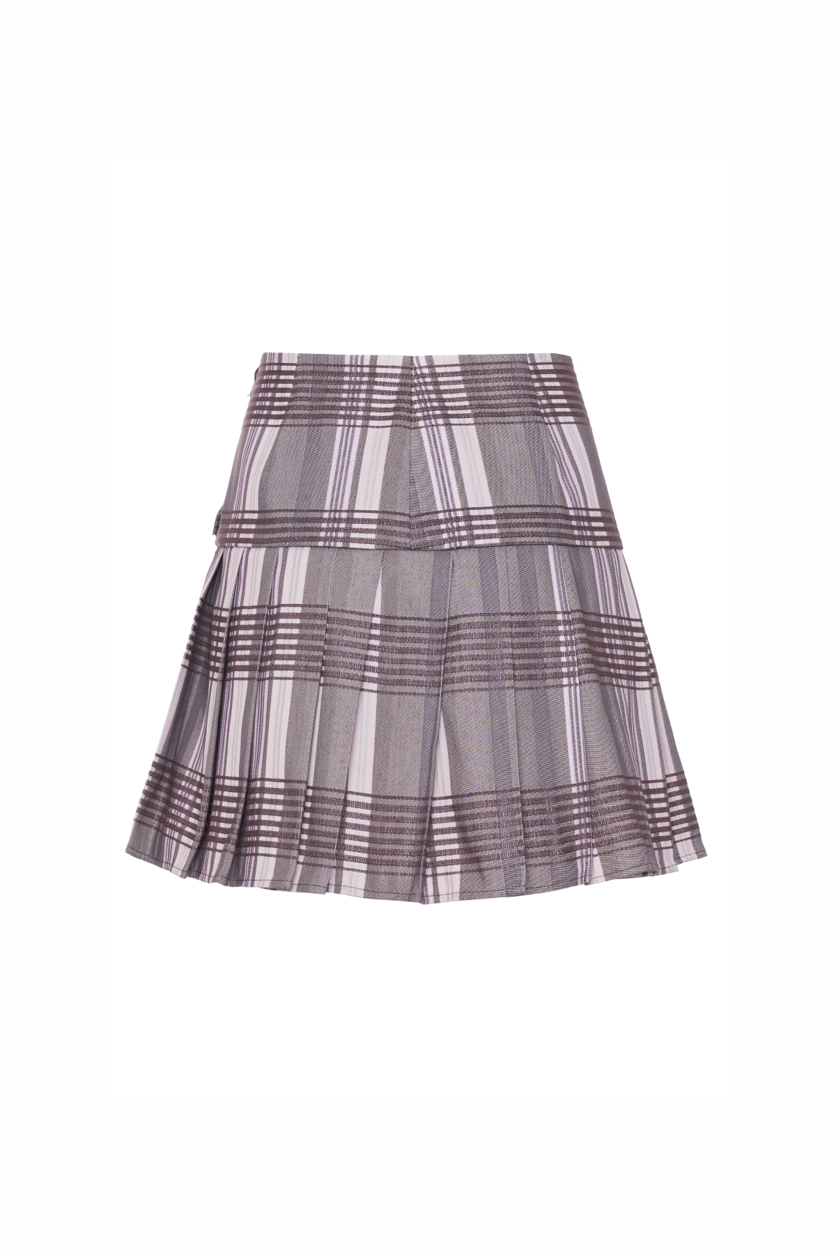 Saia curta em jacquard, com estrutura leve e acabamento sofisticado. O modelo possui pregas amplas que criam movimento, cintura marcada e possui detalhe de cinto embutido com fivela destacando o desenho do tecido. Fechamento por zíper invisível nas costas.