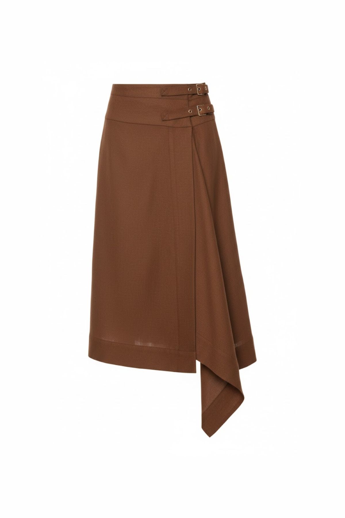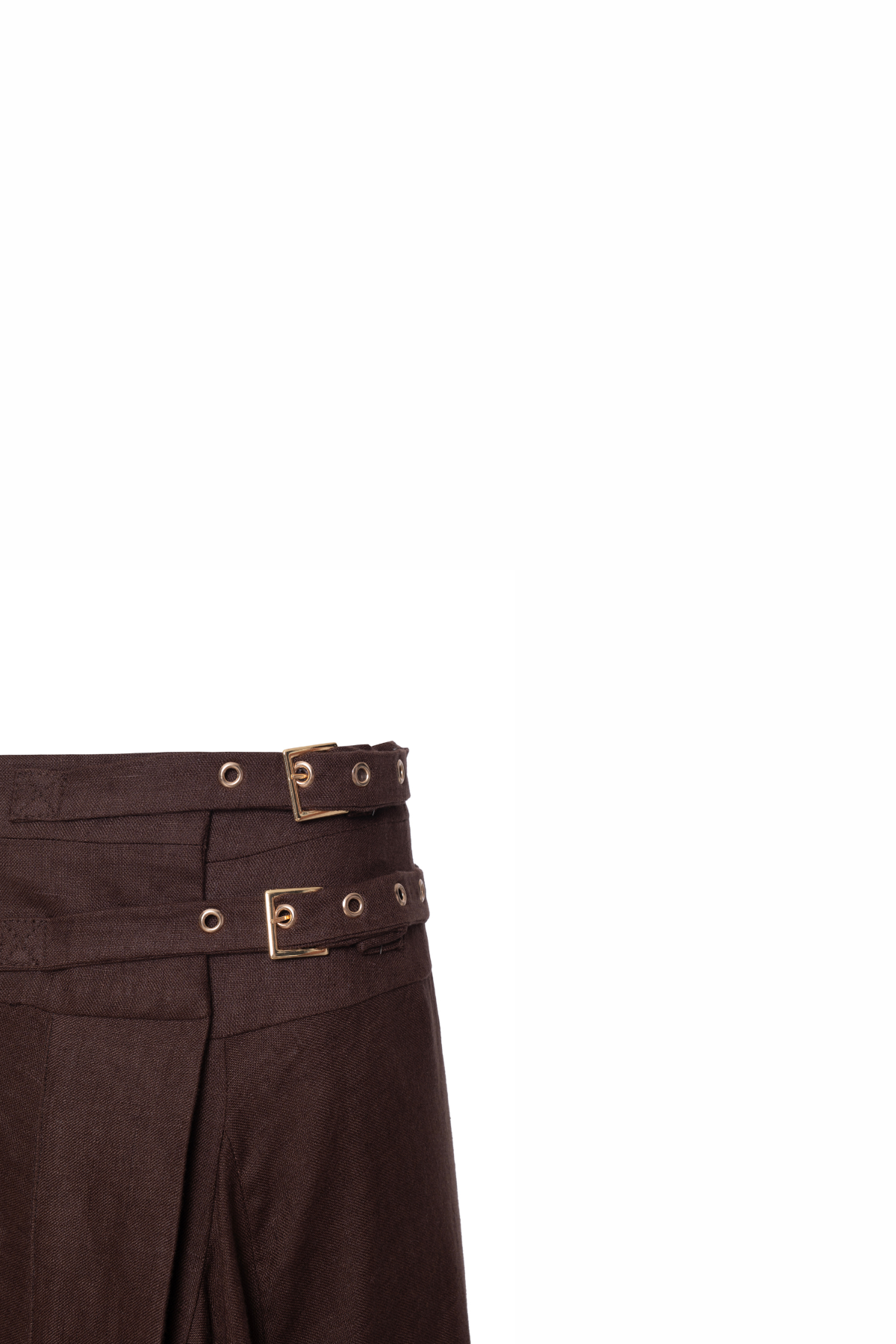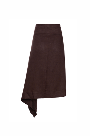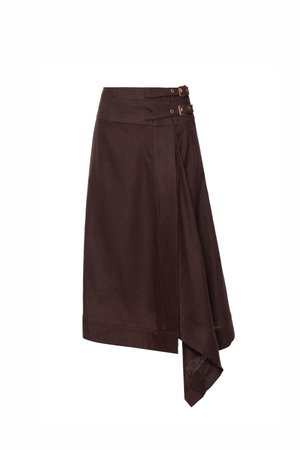 Saia em linho, apresenta cintura alta com fechamento em fivelas metálicas. A saia tem um bico assimétrico na barra, deixando a peça moderna e cheia de personalidade.