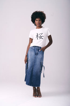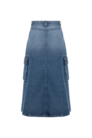 Esta saia mídi em jeans Defender apresenta uma modelagem reta elegante, valorizada por recortes frontais que proporcionam um design moderno e estruturado. Os bolsos cargo laterais com tiras adicionam funcionalidade e estilo contemporâneo, enquanto o fechamento frontal por zíper e botão garante praticidade e segurança. Ideal para composições sofisticadas e urbanas, combina conforto com um toque de atitude.