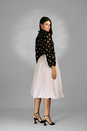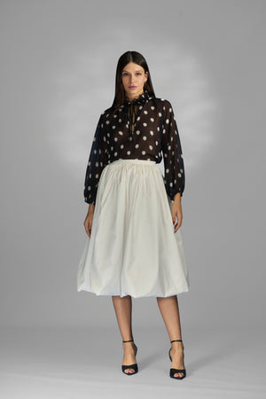 Saia mídi balonê. Com seu design volumoso e franzido, proporciona um visual estruturado e elegante, perfeito para quem busca um look diferenciado.