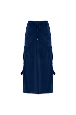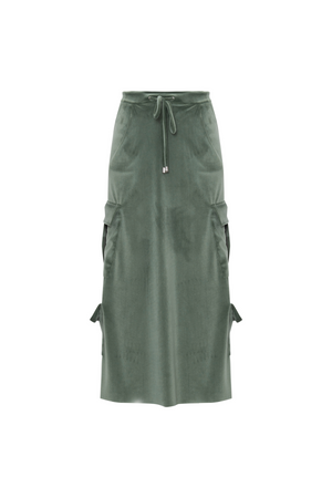 Saia mídi de veludo combina conforto e estilo, a peça possui um toque suave. O modelo conta com cintura ajustável por um cordão, garantindo conforto e um ajuste personalizado. O detalhe mais marcante são os bolsos cargo laterais que adicionam um toque utilitário ao visual.