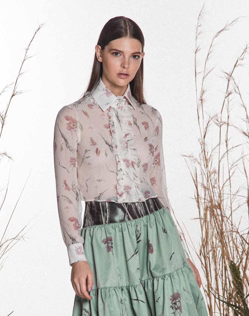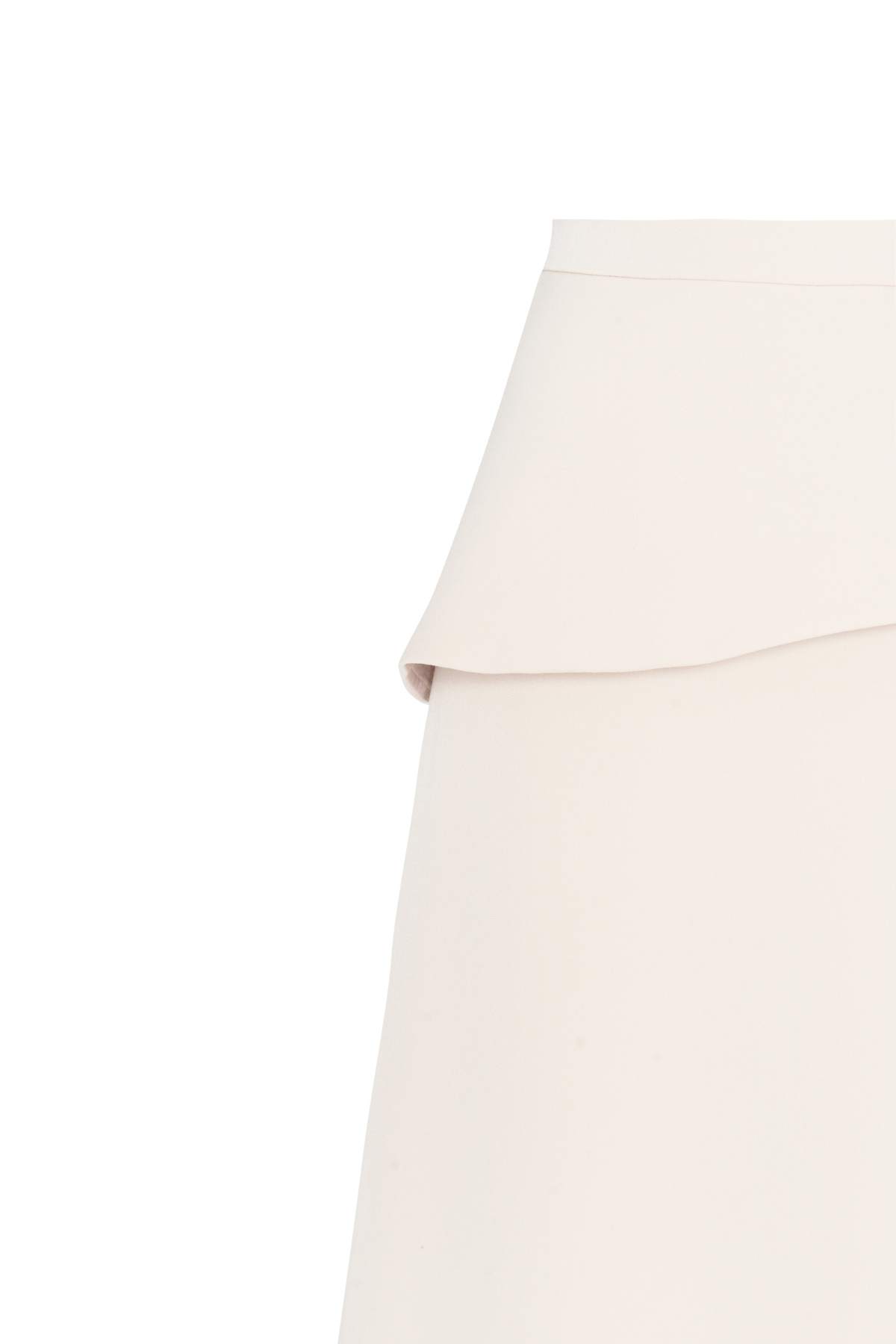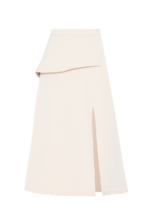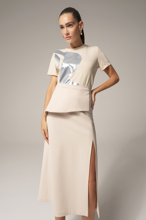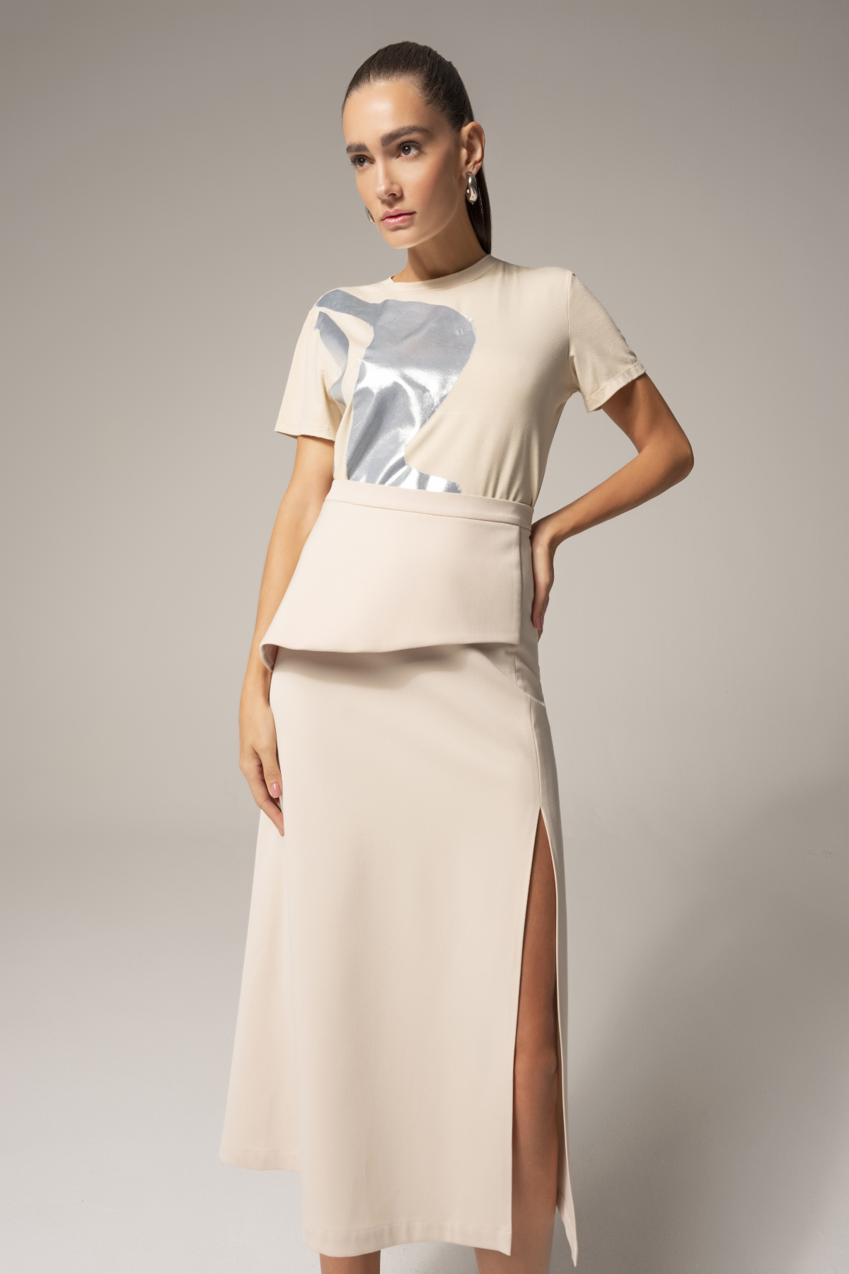 Saia midi com peplum na cintura, uma camada extra de estilo e sofisticação, criando uma silhueta feminina, enquanto a fenda lateral acrescenta um toque de ousadia.