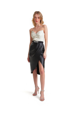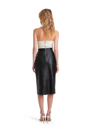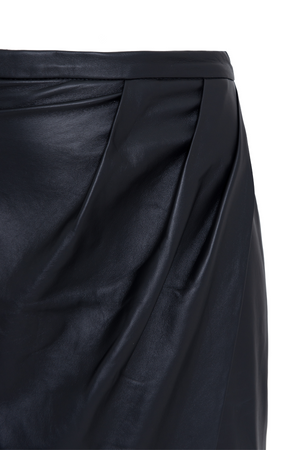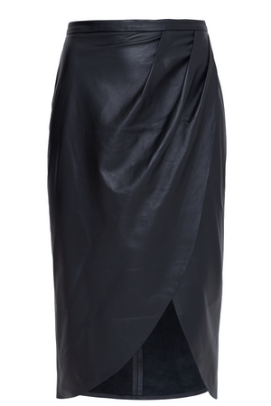 Saia de couro mídi transpassada, com fechamento posterior por zíper. O couro é um símbolo de sensualidade e poder em looks que podem ser usados durante dia ou noite. Faça sua produção combine com nossos corselets ou blusas.