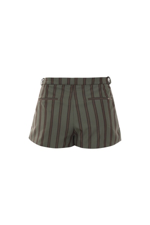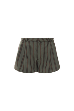 Short curto confeccionado em tecido de alfaiataria listrada, com modelagem balonê. Possui cós com passantes, bolsos laterais e fechamento frontal por zíper e fecho.