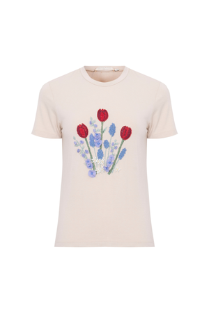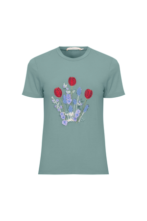 T-shirt Baby Look de gola redonda, de malha age, super confortável. Possui um delicado bordado exclusivo de flores em tons vibrantes com linha e pedrarias, garantindo um toque artesanal e romântico a peça. Ideal para quem busca conforto e estilo em suas produções.