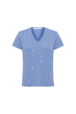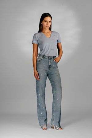 T-shirt Baby Look feita de tecido macio e confortável, possui detalhes bordados com cristais, trazendo um toque de elegância ao seu look. A gola em V é perfeita para dar um toque diferenciado e moderno ao visual. Ideal para todos os tipos de ocasiões.