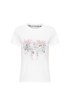 T-shirt em algodão pima com modelagem reta, gola redonda e mangas curtas. Estampa frontal com ilustração de cenário japonês e figuras de gueixas.