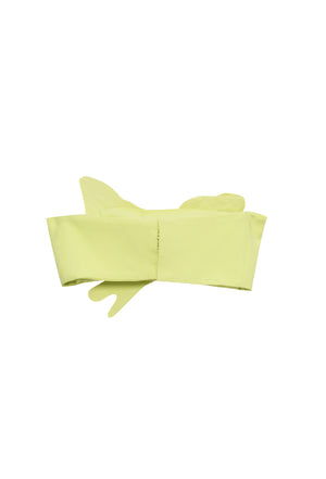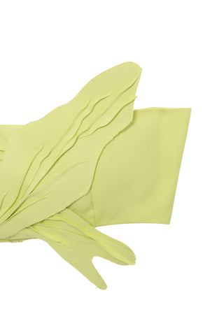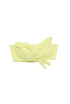 Top estilo faixa, de crepe, com detalhes de folhas em 3D, no mesmo tecido. Fechamento por botões atrás.