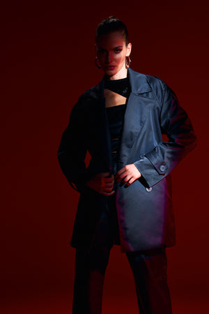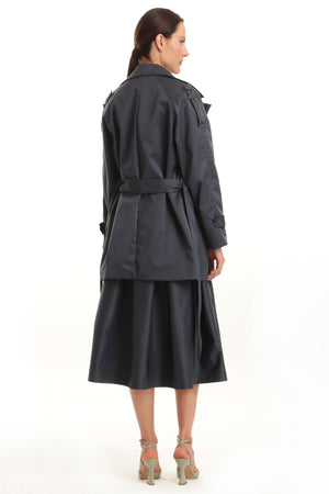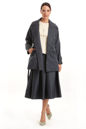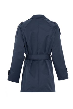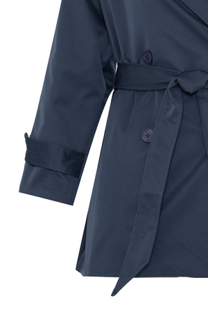 Trench coat, comprimento mais curto, mangas longas com punho, gola com lapelas. É perfeito para os dias mais frios, pode ser usado tanto fechado ou aberto, com peças como calça e camisa ou vestidos.