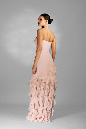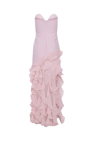 Vestido tomara que caia e decote profundo em coração, que valoriza o colo. A peça possui uma saia com camadas de babados em diagonal, criando um visual romântico. O corte ajustado ao corpo destaca a silhueta.