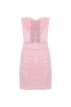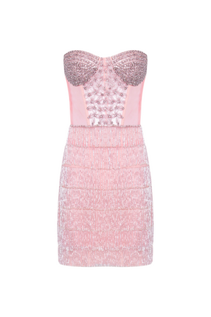 Vestido curto com corpete estruturado e bordado em strass, transparência lateral e saia inteiramente bordado com mini franjas.