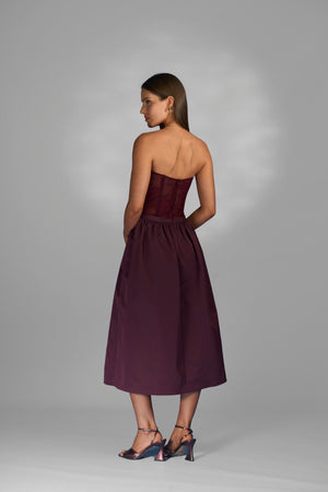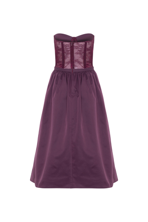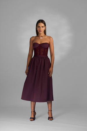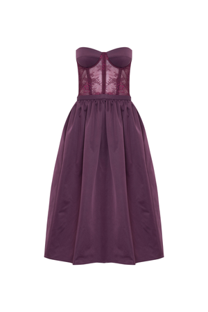 Este vestido mídi combina elegância e estrutura com seu corset rendado, realçado por barbatanas que proporcionam sustentação e ajuste perfeito. A saia de tafetá com pregas adiciona movimento e um toque sofisticado, ideal para ocasiões que pedem estilo refinado e aparência imponente.