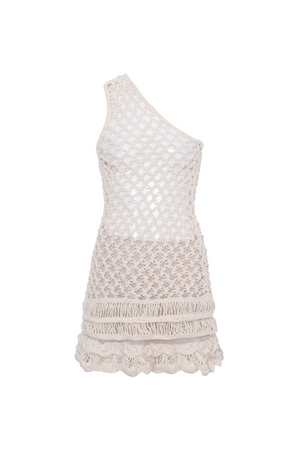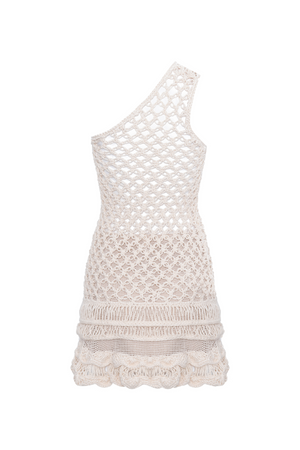 Vestido de crochet todo vazado de um ombro só com detalhe na barra.