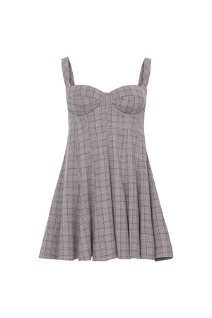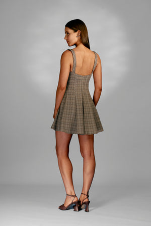 Vestido curto com alças largas, bojo e saia evasê. Sua saia adiciona movimento e leveza ao visual, garantindo um caimento fluido. O padrão clássico de xadrez Príncipe de Gales confere elegância atemporal.