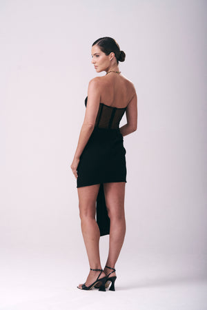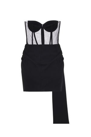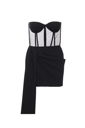 Vestido curto que combina elegância e estrutura. O corpete em tule illusion com barbatanas e recortes precisos cria uma silhueta marcada, enquanto o bojo oferece suporte e definição. A saia em crepe apresenta modelagem ajustada que segue as curvas, realçada pela faixa lateral aplicada que adiciona movimento e sofisticação. Fechamento por zíper invisível nas costas garante um acabamento impecável e discreto.
