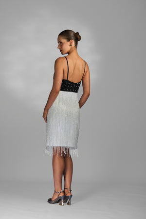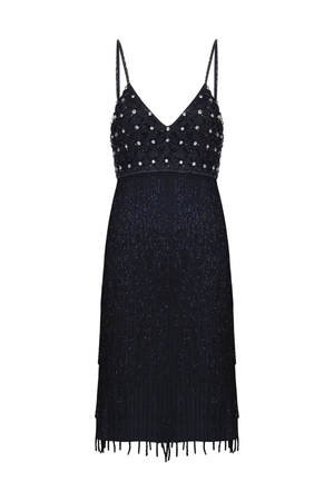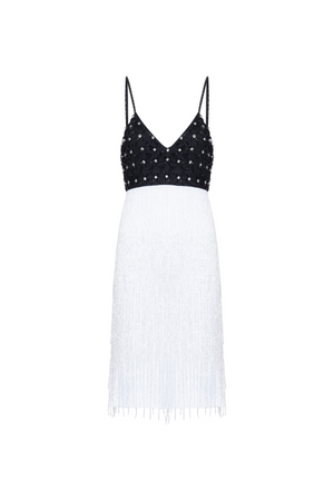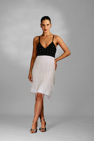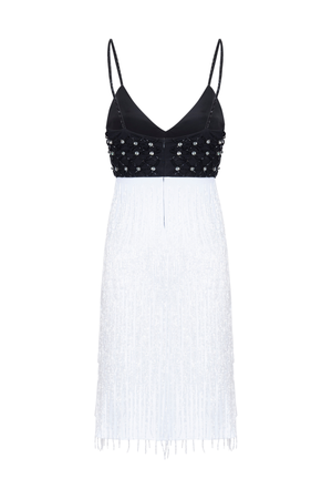 Este vestido curto bordado a mão é uma peça única e elegante. Com decote em V e alças finas, possui um delicado bordado 3D na parte superior que traz um toque de sofisticação. As franjas na parte inferior adicionam movimento e estilo ao vestido. Perfeito para ocasiões especiais.