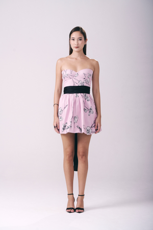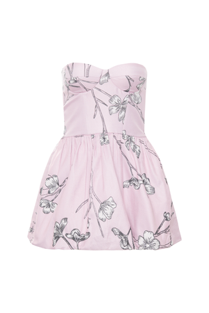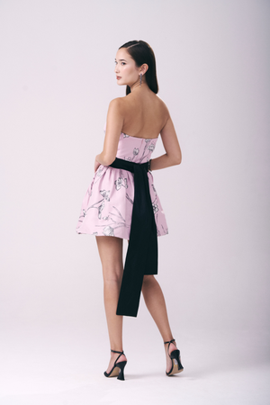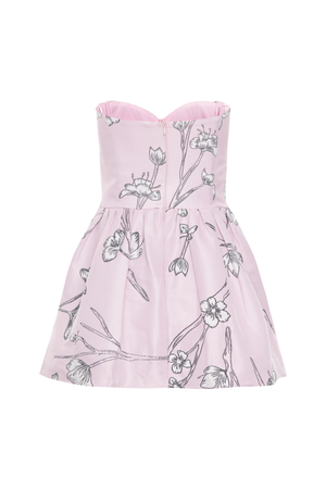 Este vestido curto em jacquard apresenta uma delicada estampa de flores de cerejeira, que confere elegância sutil. A parte superior estruturada com bojo e decote coração valoriza o busto, enquanto a faixa larga na cintura realça a silhueta feminina. A saia balonê oferece um toque de volume leve e sofisticado, finalizada com zíper invisível nas costas para um caimento perfeito. Ideal para ocasiões que pedem charme e requinte.