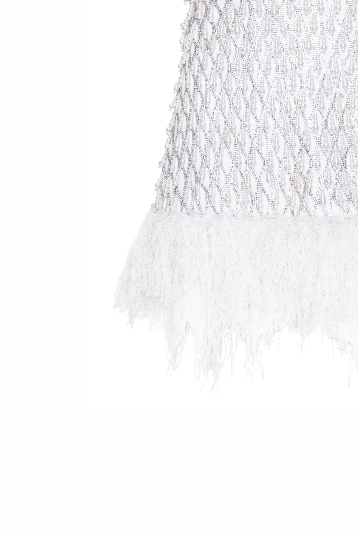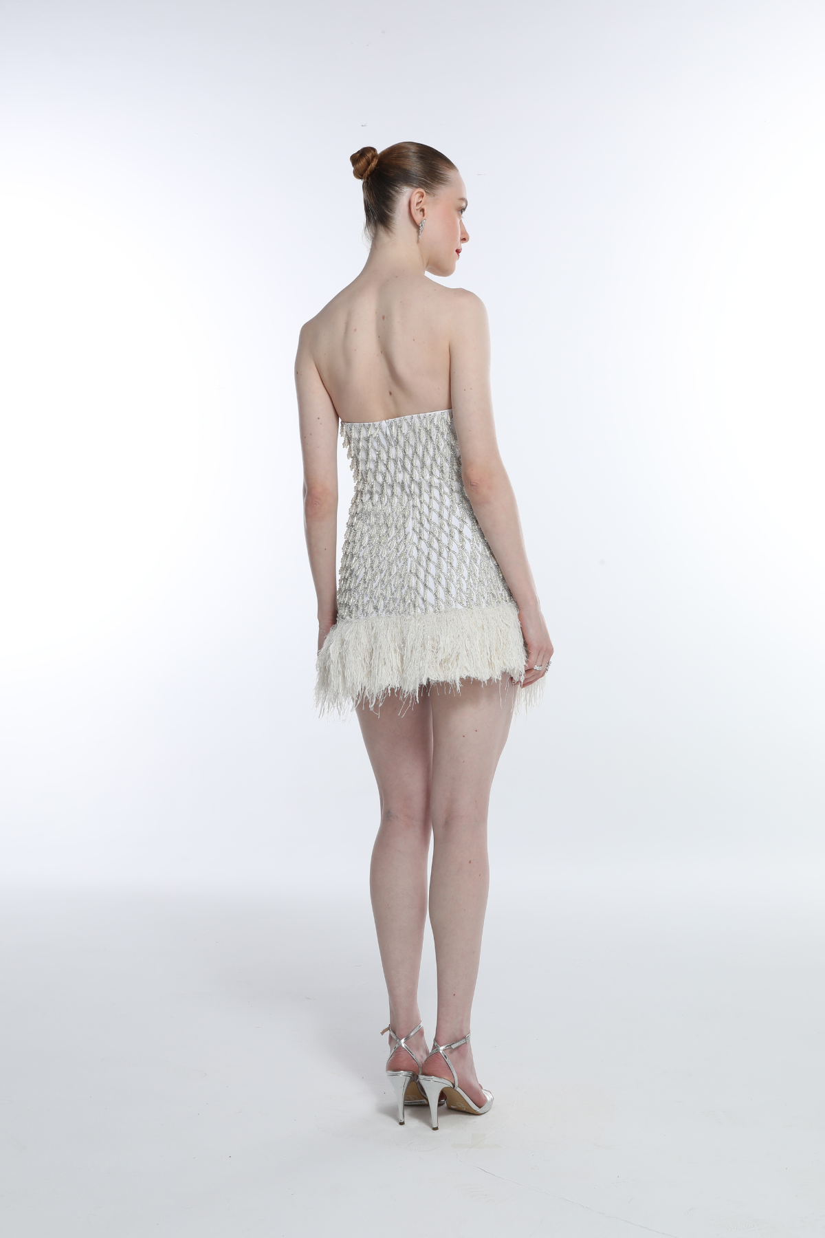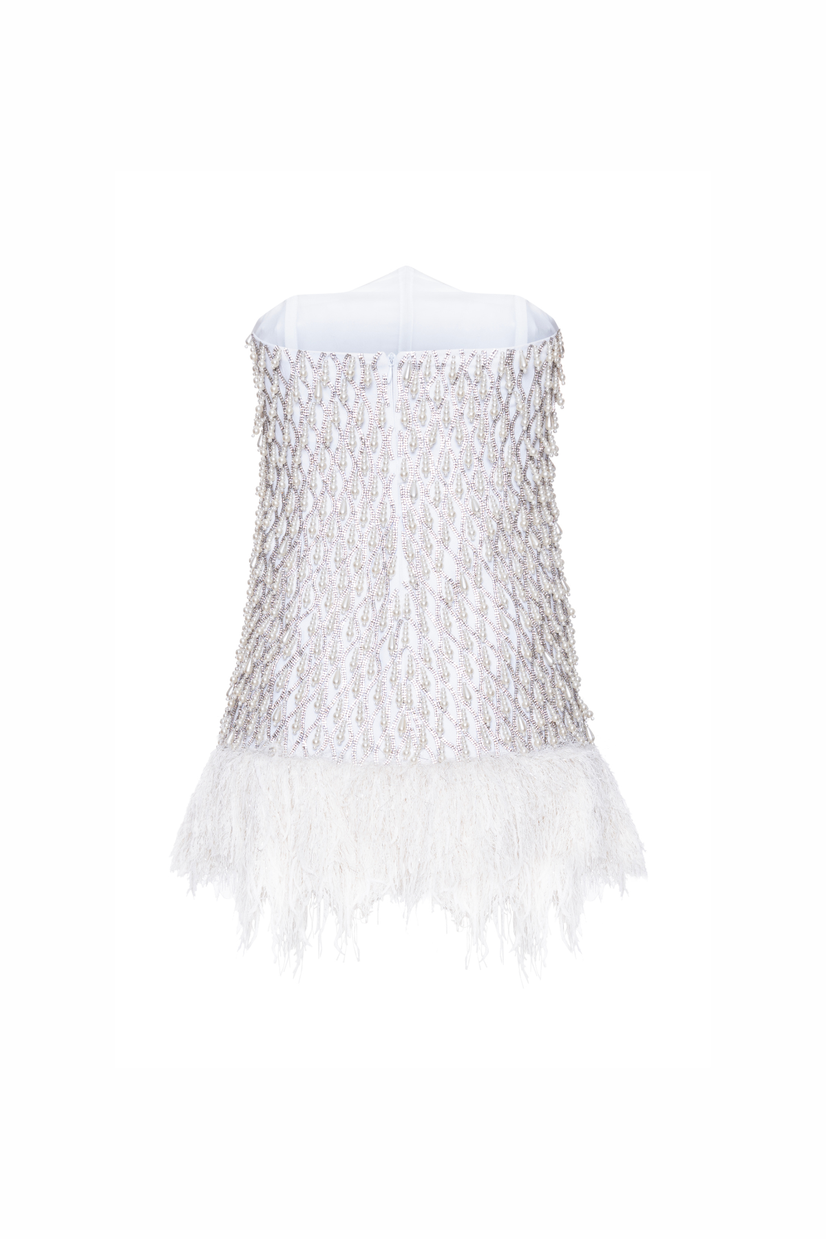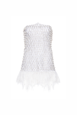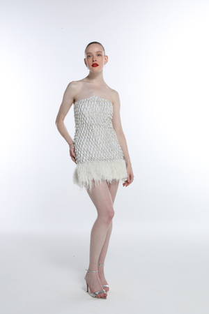 Vestido mini despojado e refinado, em crepe com bordados artesanais meticulosos e com cristais. A barra com plumas traz leveza e movimento ao design, criando uma peça contemporânea que equilibra maximalismo com glamour para quem busca impacto elegante.