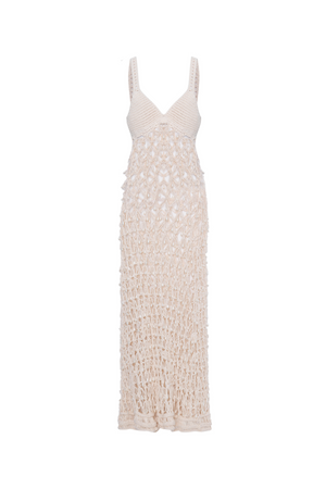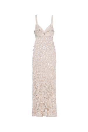 Vestido de crochet vazado, com decote em "V", alças finas, bordado com penduricalho de pérola em toda a peça. Possui forro.