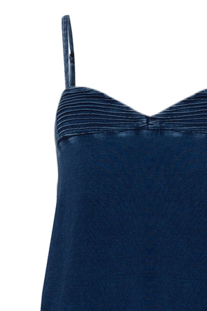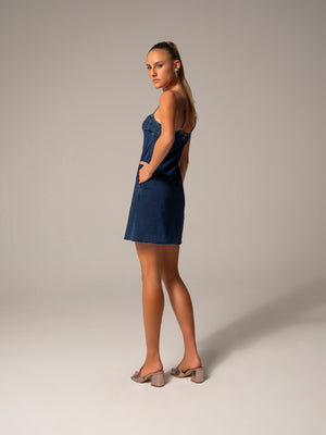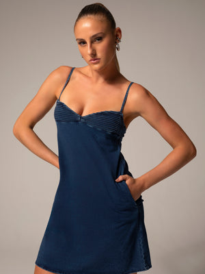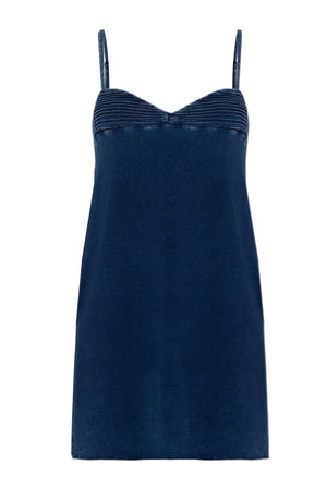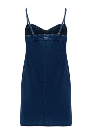 O vestido curto de Malha Denim com alças é uma peça versátil que combina conforto e estilo. O detalhe das nervuras no busto adiciona uma dimensão extra ao design, criando uma textura sutil e interessante que realça a feminilidade da peça.