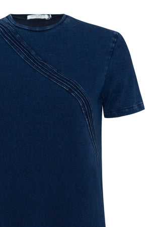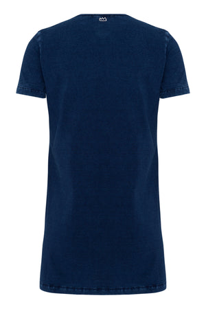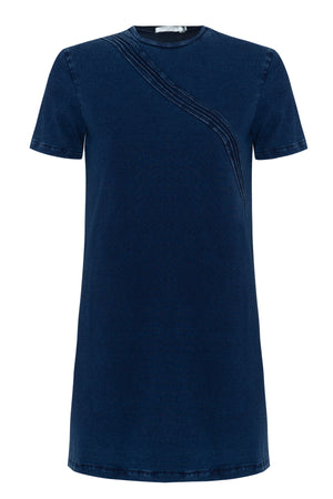 Vestido camisetão curto com mangas, de malha denim, possui uma textura suave e maleável, o tecido abraça o corpo de forma elegante, proporcionando liberdade de movimento sem comprometer o visual. O detalhe frontal de ondas adiciona um toque de originalidade à peça.