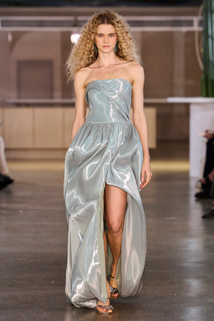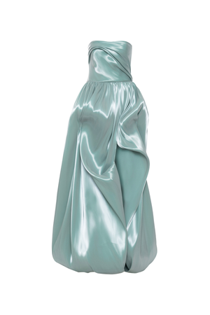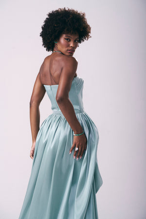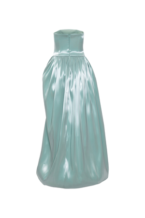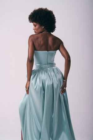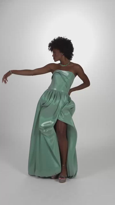 Este vestido longo exclusivo em tecido Liquid combina sofisticação e glamour. Com corpo estruturado em corset e zíper invisível nas costas, oferece ajuste perfeito e elegância. A saia balonê com fenda frontal adiciona movimento e um toque sensual, ideal para ocasiões especiais que pedem um visual marcante e refinado.