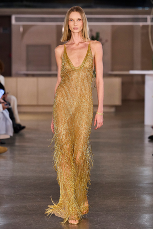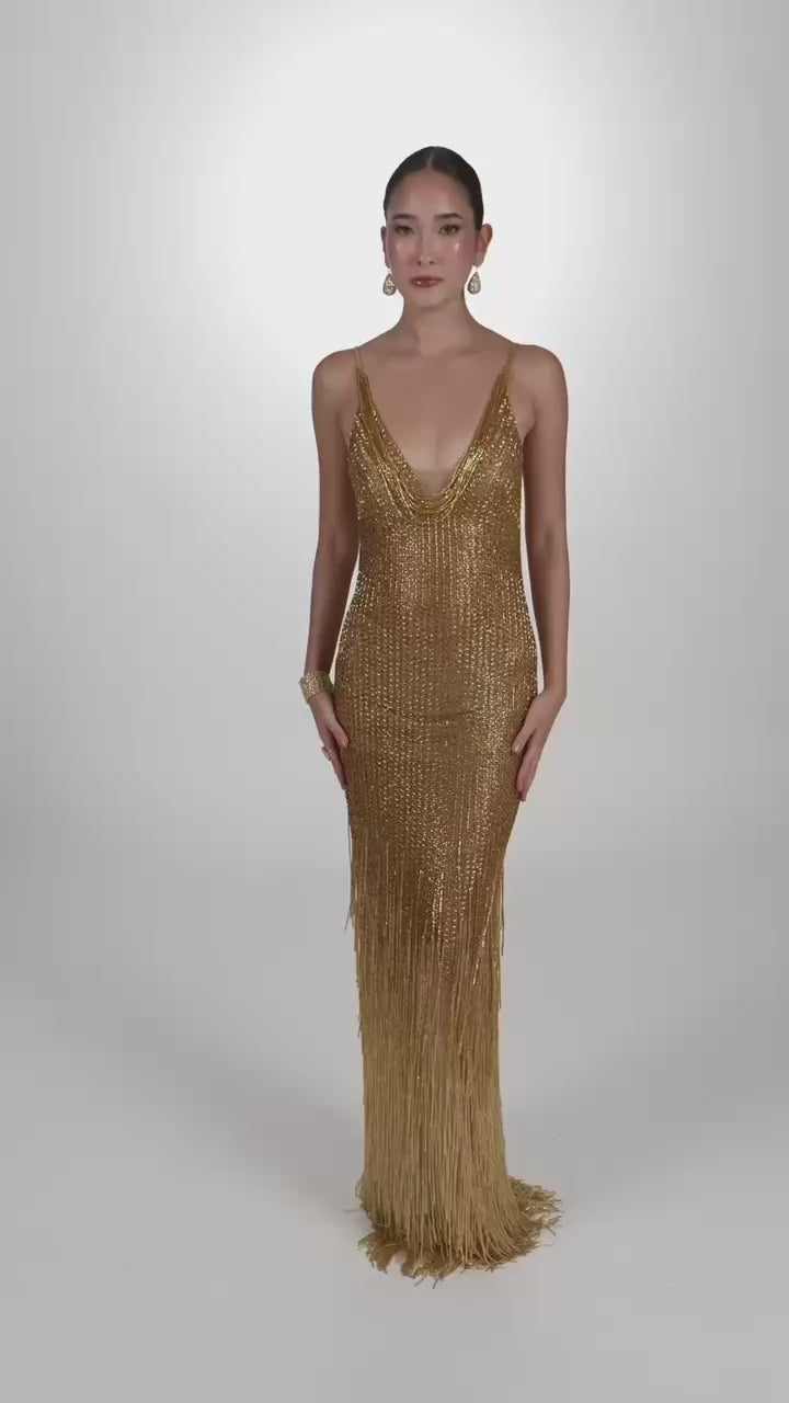 Este vestido longo em tule ilusion apresenta um bordado artesanal exuberante que realça sua sofisticação. Com decote em V frontal e profundo nas costas, valoriza a elegância feminina. A saia, finalizada com franjas longas bordadas, alonga a silhueta com delicadeza. O fechamento por zíper invisível nas costas assegura um caimento impecável, perfeito para eventos que exigem um visual refinado e marcante.