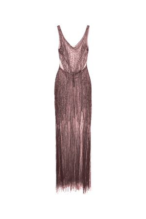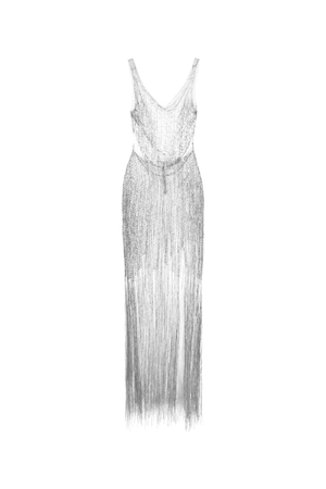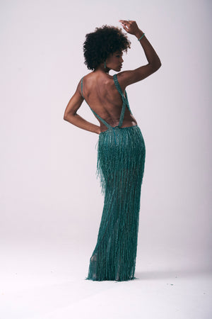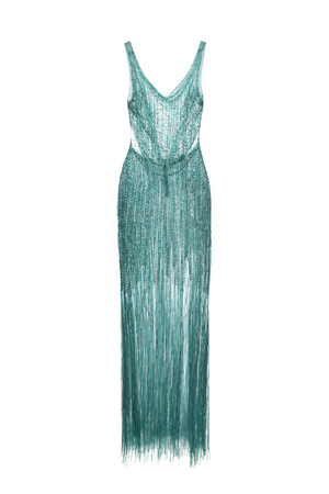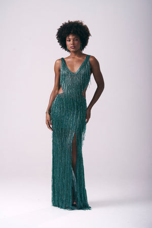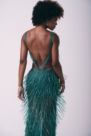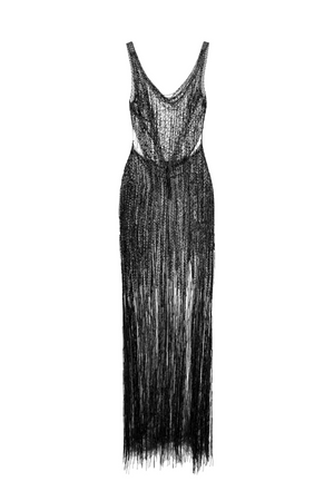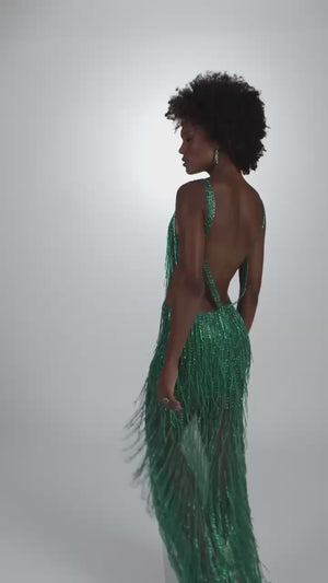 Este vestido longo em tule ilusion é uma peça exuberante, bordada à mão com franjas de vidrilhos que conferem movimento e brilho delicado. O decote em V valoriza o colo, enquanto os recortes laterais na cintura realçam a silhueta. A fenda frontal adiciona um toque de sensualidade elegante. Nas costas, o design aberto com alças finas quase cruzadas cria um visual sofisticado e moderno. O fechamento por zíper invisível garante acabamento impecável e conforto. Ideal para ocasiões especiais que pedem charme e requinte.