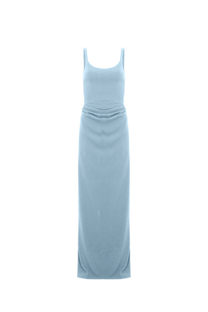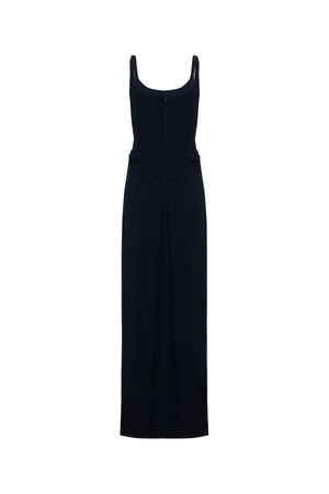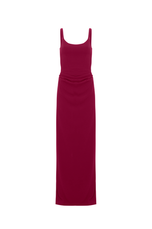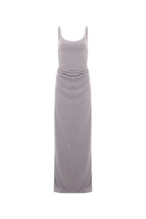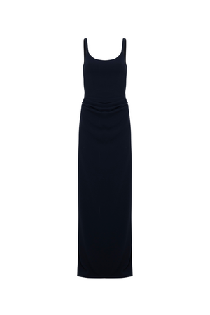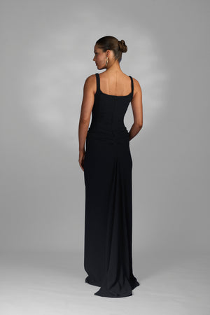 O auge da elegância minimalista. Vestido longo em crepe, possui caimento impecável e alças médias com decote reto. O detalhe drapeado na cintura adiciona movimento e valoriza a silhueta. Perfeito para eventos sofisticados.