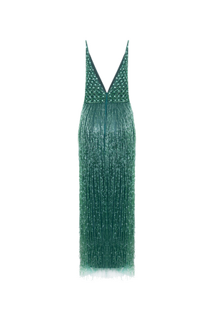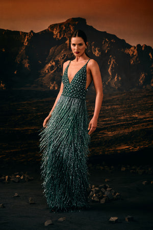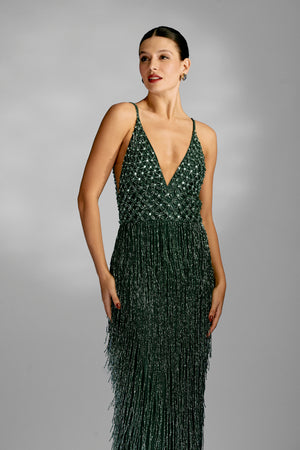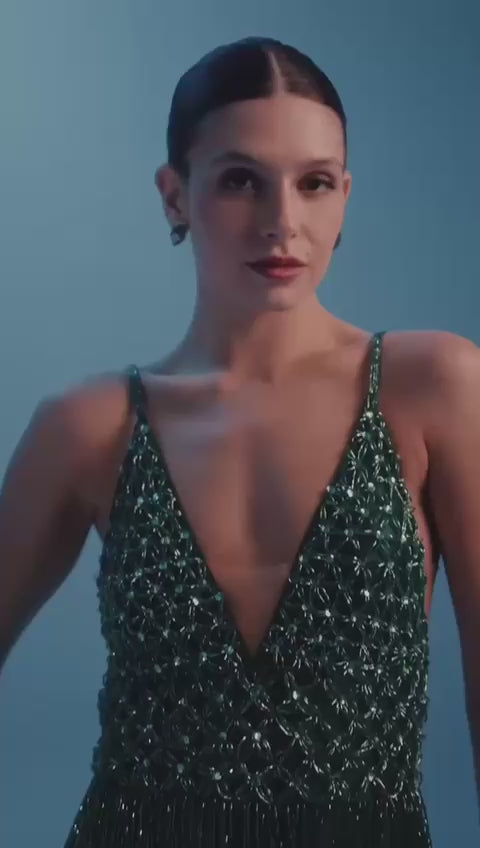 O Vestido Longo Bordado e Decote em V é um vestido elegante e delicado, com bordado feito à mão em todo o corpo e saia de franjas com vidrilhos. Suas alças finas adicionam um toque de sofisticação, tornando-o perfeito para ocasiões especiais. A atenção aos detalhes e qualidade artesanal garantem um look luxuoso e exclusivo.