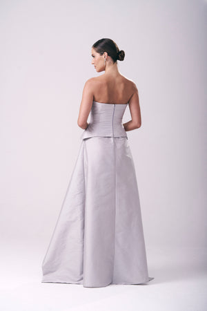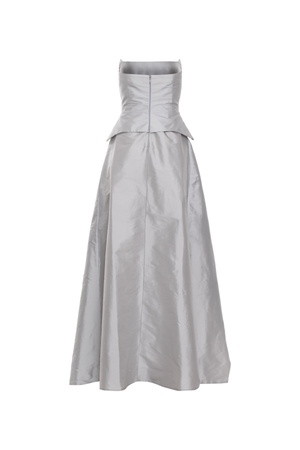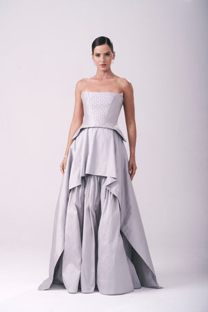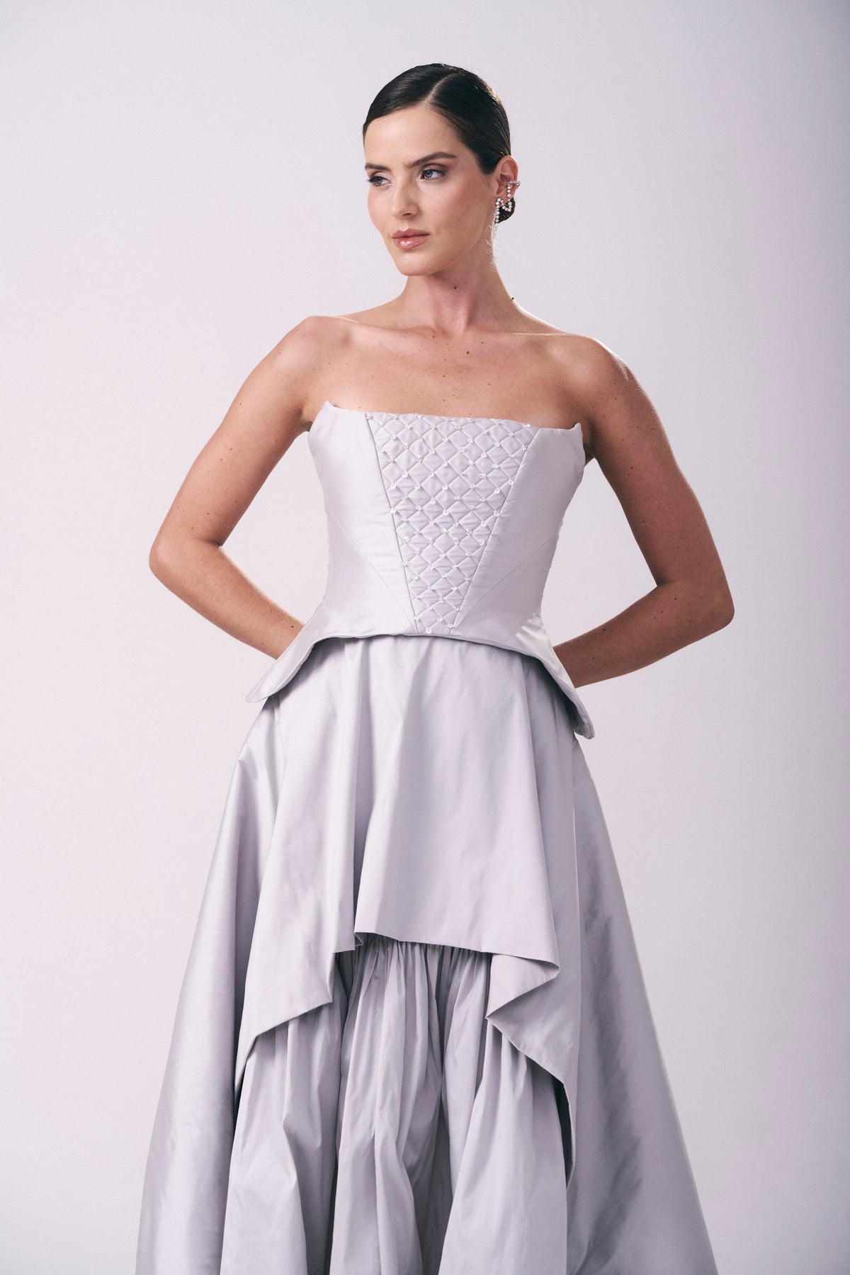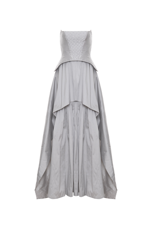 Vestido longo elegante em tafetá. Sem alças, apresenta um corset estruturado bordado em cristais. A saia desenvolve-se em múltiplas camadas sobrepostas, criando volume discreto e movimento através do efeito de franzido. Uma criação sofisticada para momentos que pedem presença, combinando estrutura impecável com feminilidade.
