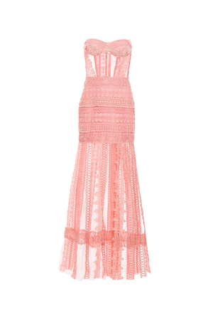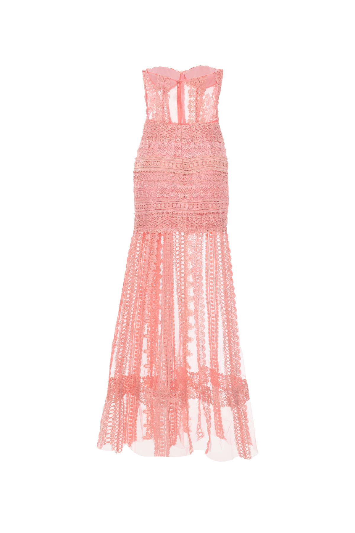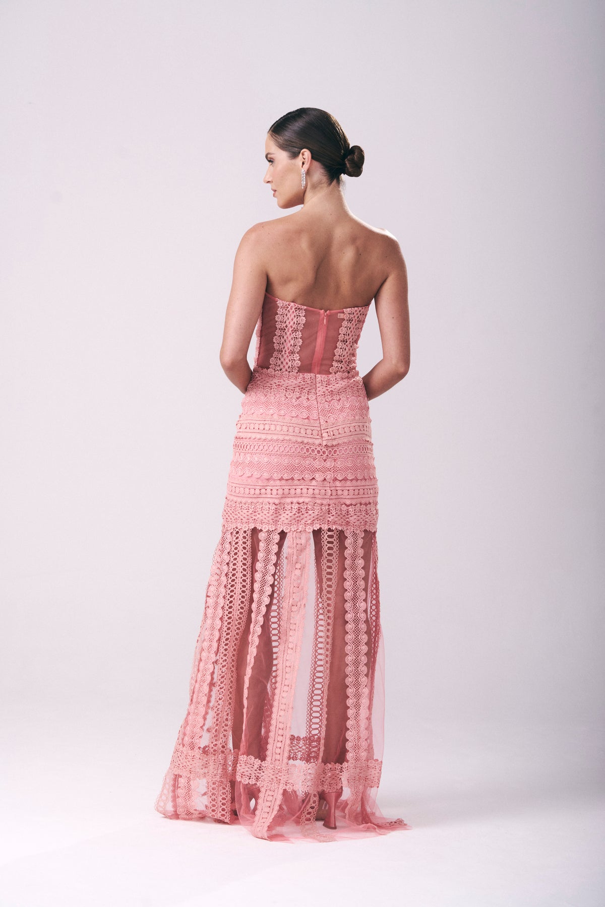 Elegância em movimento. Este vestido longo apresenta decote sem alças com corpo estruturado em corset. Em patchwork de rendas diversas sobre tule, a peça combina texturas delicadas com design moderno. Detalhes estratégicos de transparência e fenda lateral conferem sensualidade discreta. O fechamento por zíper invisível nas costas assegura um acabamento impecável. Uma criação que harmoniza estrutura e fluidez, ideal para quem busca uma declaração de estilo refinado em ocasiões memoráveis.