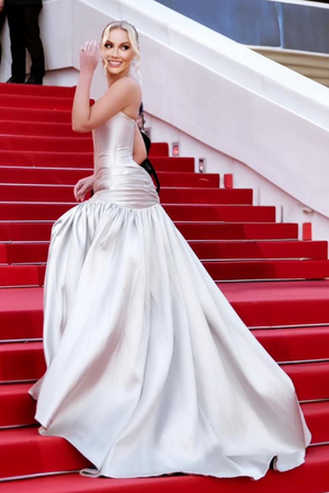 Digno de Red Carpet! Vestido longo em zibeline, com estrutura de corselet comprido, possui barbatanas pespontadas e saia ampla, toda drapeada com pregas.