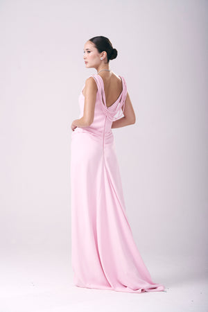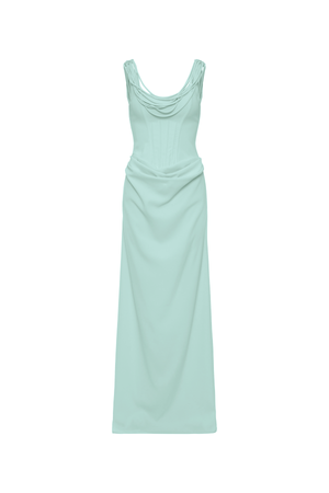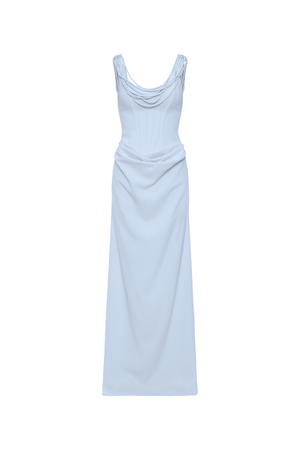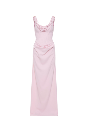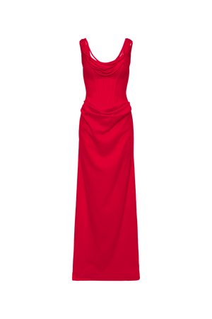 Vestido longo em crepe Victoria com corset estruturado no busto, realçando a silhueta com delicadeza. As alças com franjas verticais acrescentam um toque de movimento e charme, enquanto a saia drapeada confere elegância e fluidez ao caimento. O zíper invisível nas costas garante um acabamento discreto e sofisticado, perfeito para ocasiões que pedem um visual refinado.