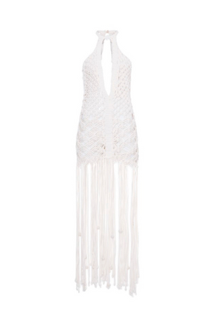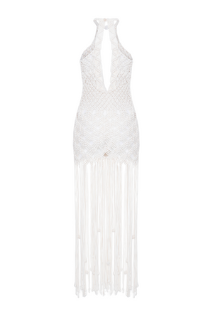 Este vestido longo é uma verdadeira obra de arte, feito cuidadosamente à mão com um incrível trabalho de macramê. O decote e as franjas adicionam um toque de elegância e exclusividade a esta peça. Perfeito para ocasiões especiais e para quem busca um visual sofisticado e único.