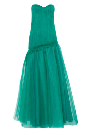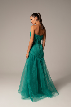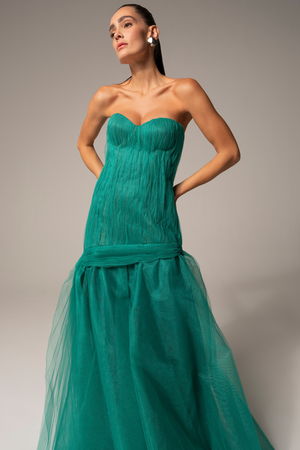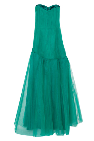 Vestido longo em tule com decote sem alças e drapeado delicado, apresentando modelagem de corpo baixo e saia volumosa. Uma peça exclusiva que une sofisticação e elegância em cada detalhe.