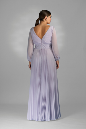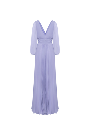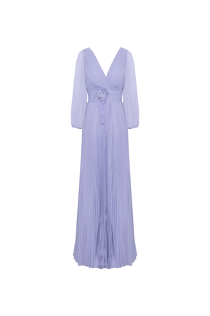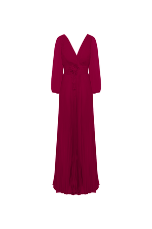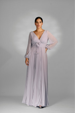 Este elegante vestido longo é feito com tecido fluido e plissado, que cria um efeito justo e favorecedor na cintura. As mangas bufantes adicionam um toque de sofisticação, enquanto o decote em V e o detalhe de flor feita à mão complementam o visual exclusivo. Ideal para ocasiões especiais.