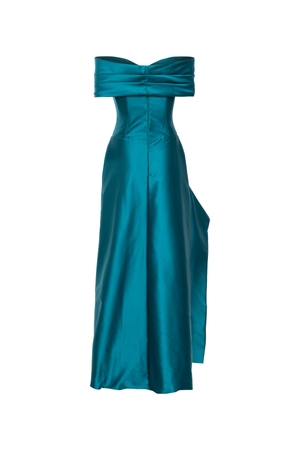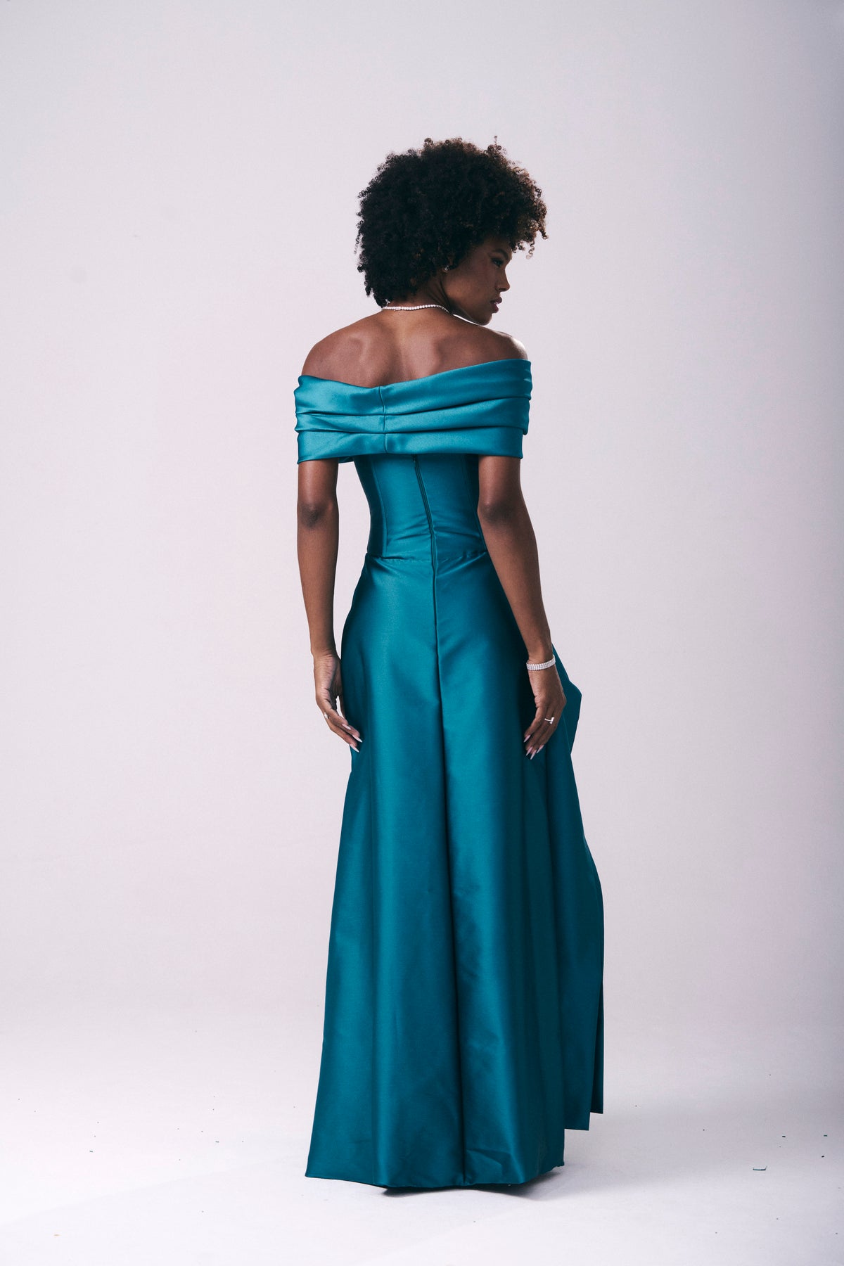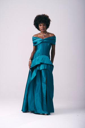 Este vestido longo em zibeline combina elegância e estrutura com seu corset marcado e recorte peplum na cintura, valorizando a silhueta de forma refinada. A saia com camadas e fenda acrescenta movimento e sofisticação, enquanto a faixa removível adiciona versatilidade ao ser usada nos ombros. Com fechamento por zíper invisível nas costas, proporciona acabamento impecável para ocasiões especiais.