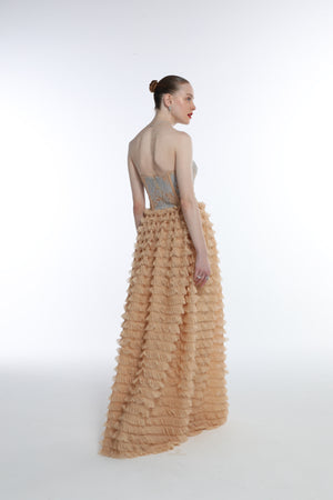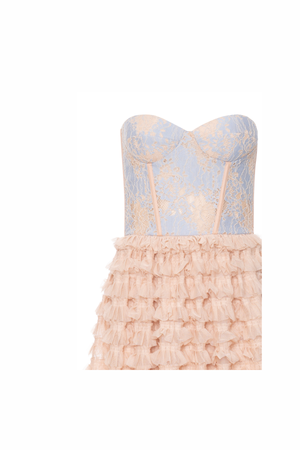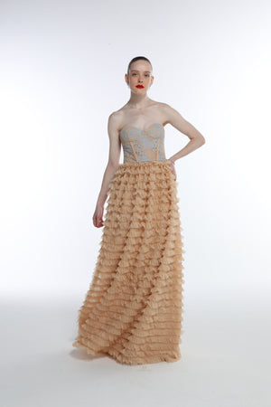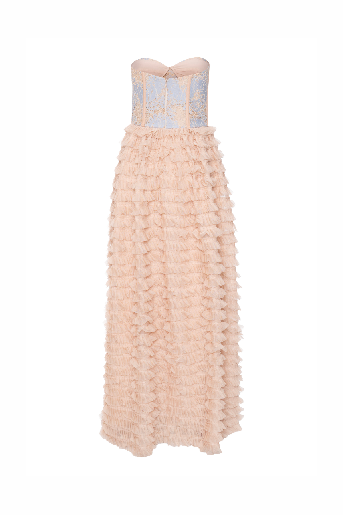 Vestido longo com corpo estruturado em renda delicada, apresentando recortes que valorizam o busto e a cintura com elegância. A transparência sutil da renda acrescenta leveza e um toque romântico à parte superior da peça. A saia é confeccionada em tule Damma, trabalhada em múltiplas camadas franzidas que criam volume, textura e um efeito tridimensional exuberante. O movimento das camadas adiciona dinamismo e um visual lúdico ao vestido.