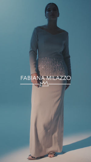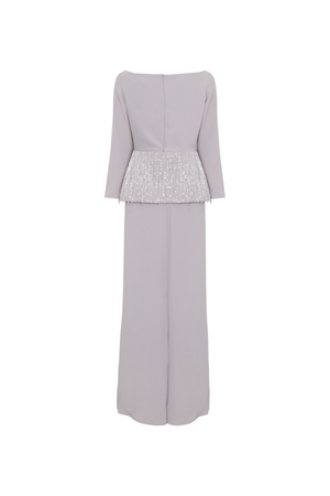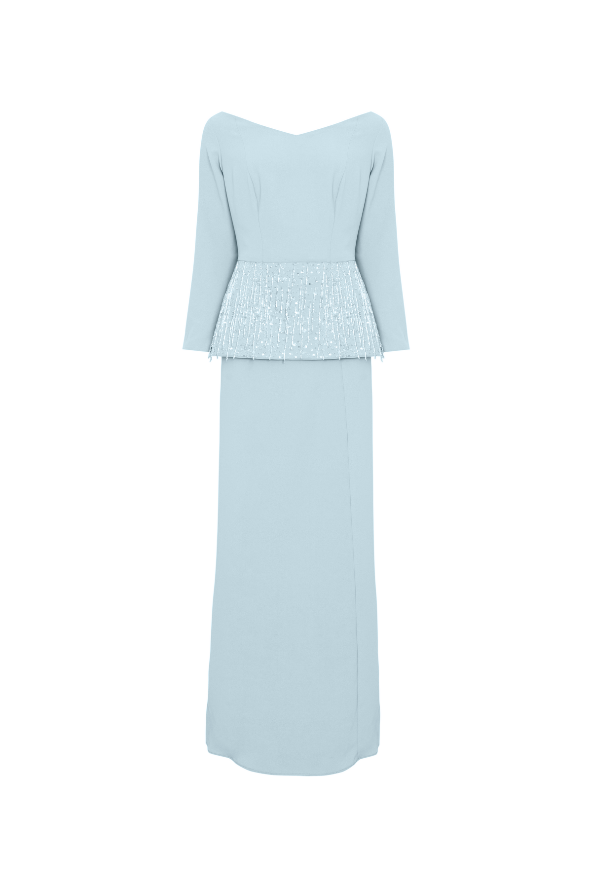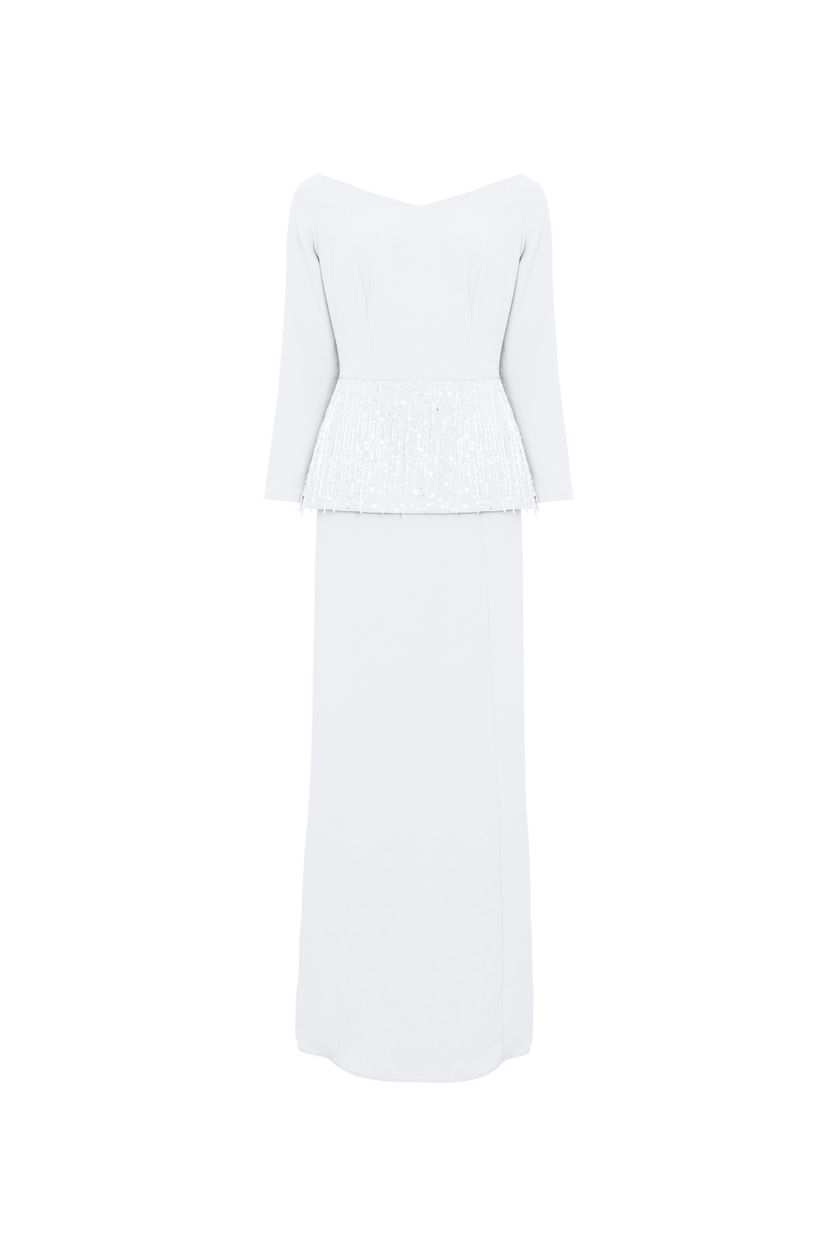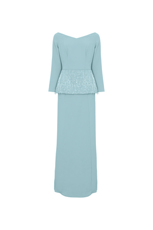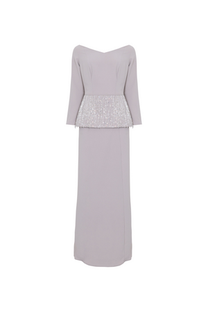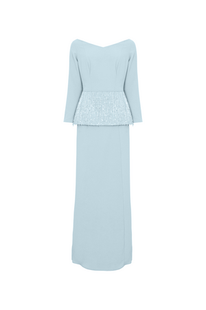 Vestido longo ombro a ombro que destaca o colo de maneira sutil. A peça conta com uma sobreposição de peplum na cintura que ajuda a definir a silhueta.