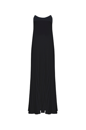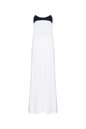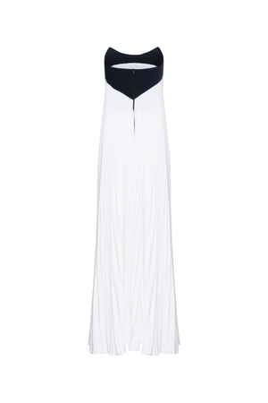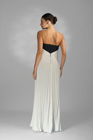 Vestido longo com busto preto tomara que caia contrastando harmoniosamente com a saia plissada em tom claro, que proporciona leveza. A modelagem fluida e o caimento reto alongam a silhueta.