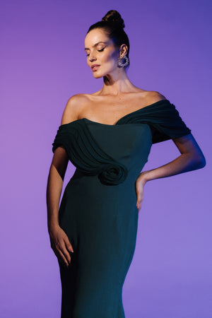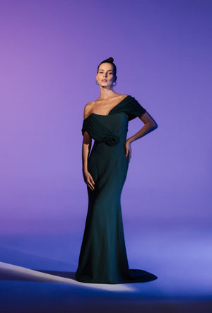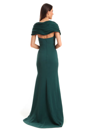 Vestido longo de crepe, elegante e atemporal, justo ao corpo, possui barbatanas de sustentação no busto, para melhor conforto. Saia sereia, com leve calda, trazendo movimento e sofisticação a peça. Detalhe em chiffon desenvolvido pela estilista para cobrir os ombros e dar todo charme e glamour necessário.