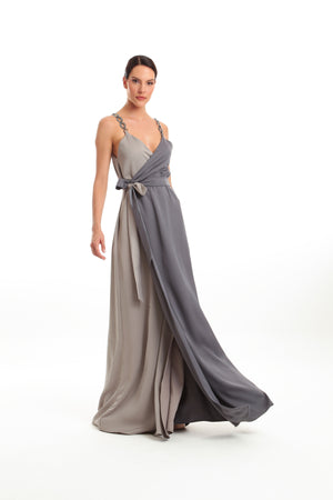 Vestido Longo Transpassado bicolor, com amarração frontal e alças com elos.