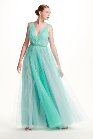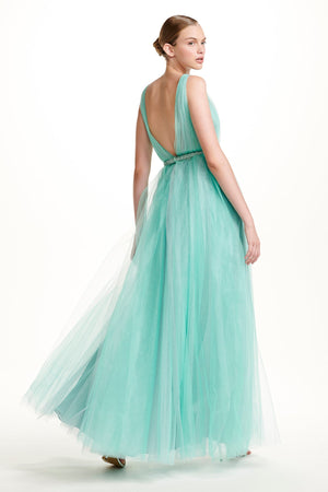 Vestido longo em tule com camadas e detalhes em tressê, decote V, sem mangas.